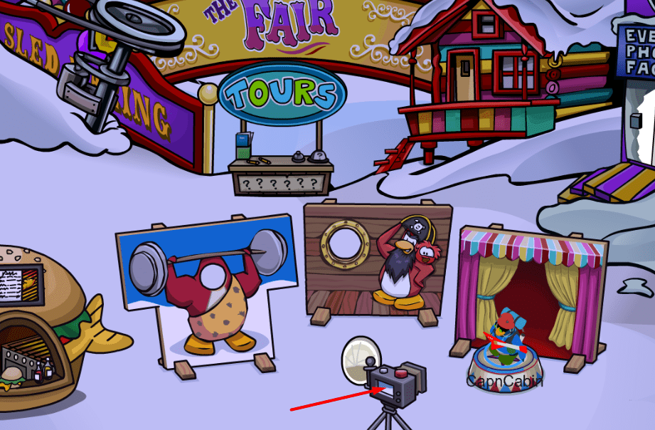 You can earn this party’s exclusive background at the Ski Village, and clicking on the camera while you are there. The location of the camera can be seen in the image below!
