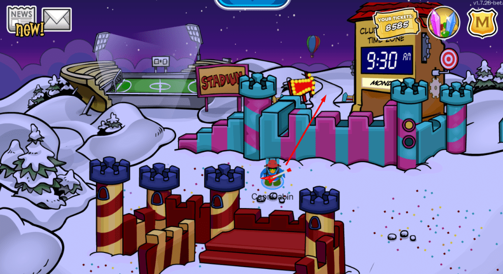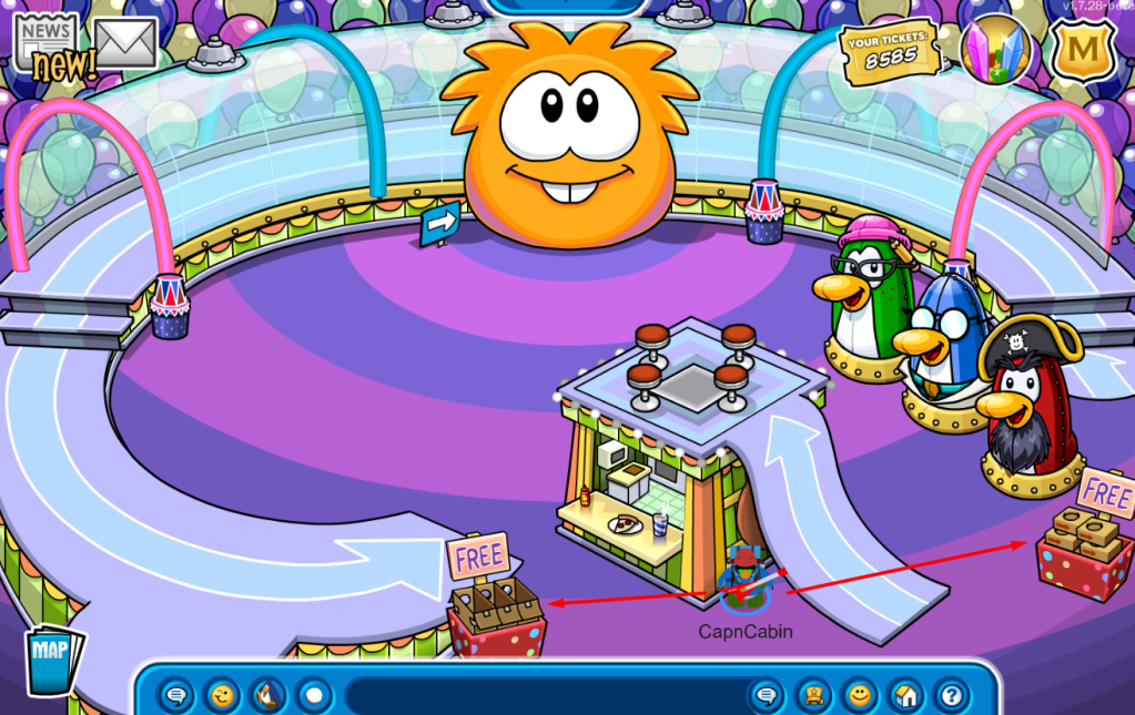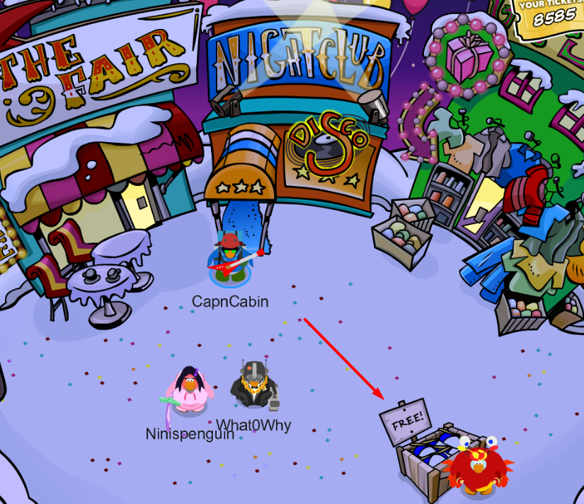 The final two free items can be found in the same room and are relatively similar themselves. One of these items is the Box Costume while the other is the Box Shoes. The room they are in is called the Whacky House. This room can be accessed through the Snow Forts and, while there, by going in the direction of the arrow in the image below.