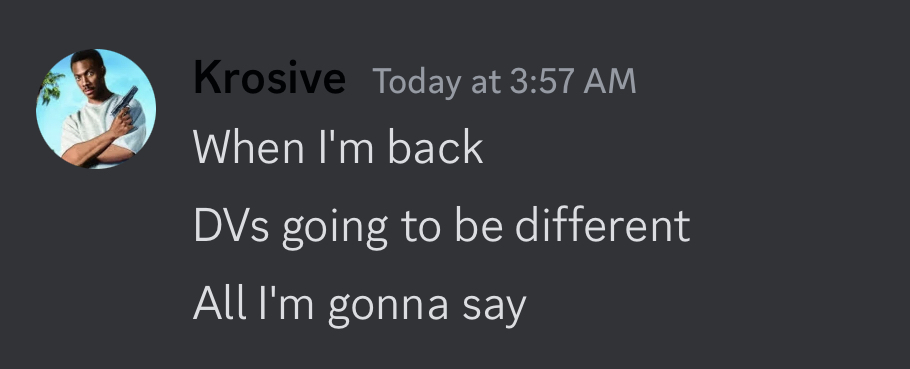 Despite everything, Krosive has yet to lead and has only shown up to one battle. His army has been defeated 7 times, and where has he been? Oh that’s right, he’s either in the bath or with his binoculars at the gym. He insults his current leadership by stating he could do better, yet he abandons his army in their time of need. He bullies his army, abandons them, and expects to bring DV to greatness upon his return.