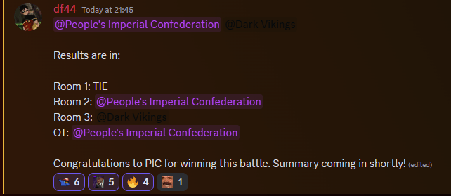 Be sure to attend the upcoming battles! Once again, thank you PIC.