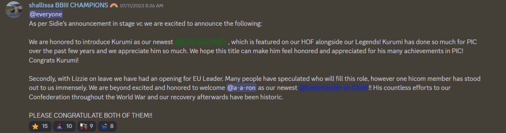 Near the end of August 2023, Premier Cabin began a vote within the congress as to whether Alucard should be elected into the body. On September 22, the election concluded in favor of Alucard’s addition and he was officially inducted two days later.