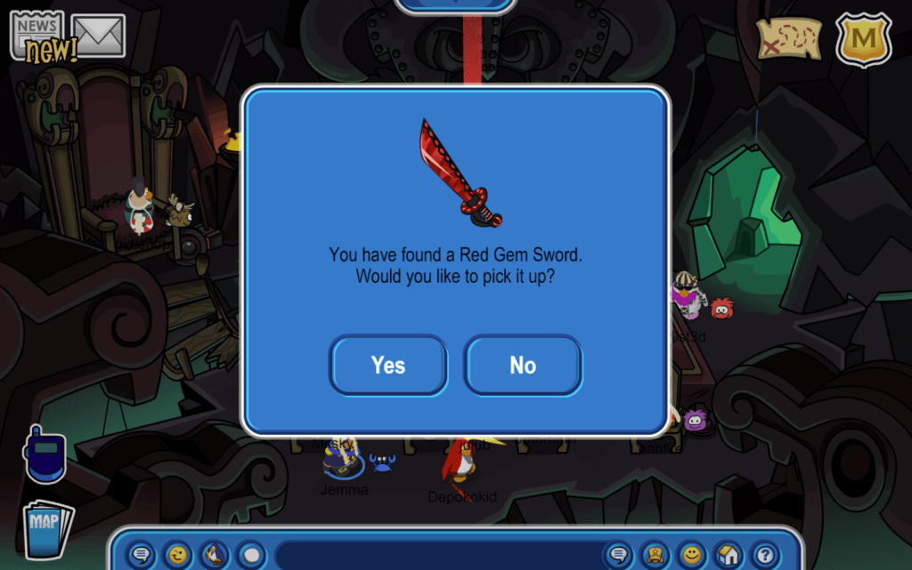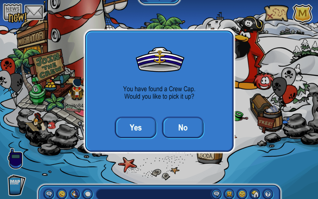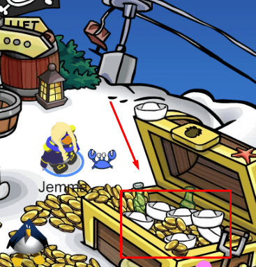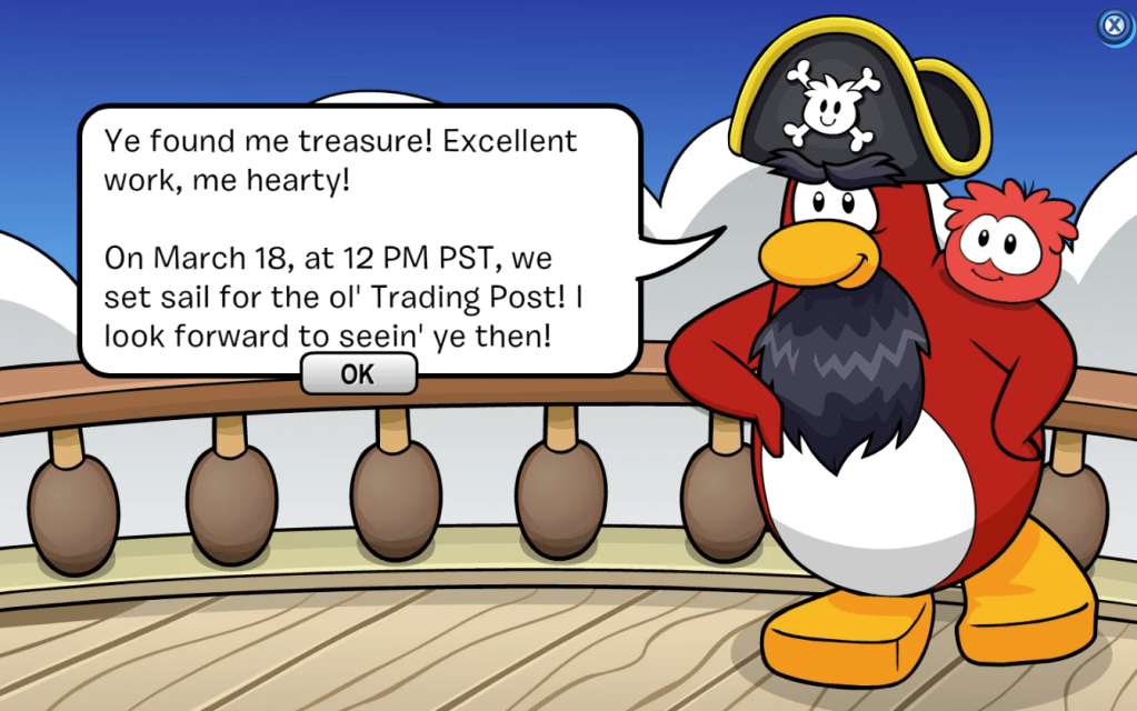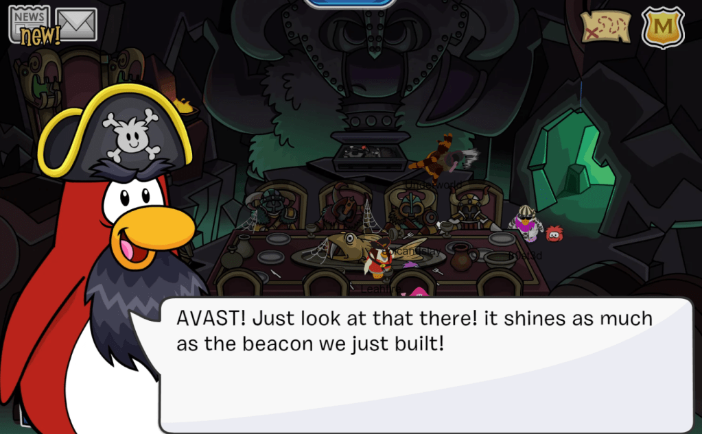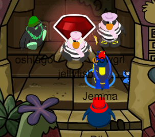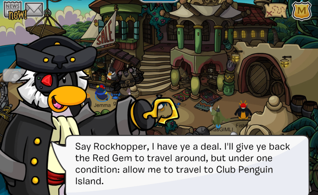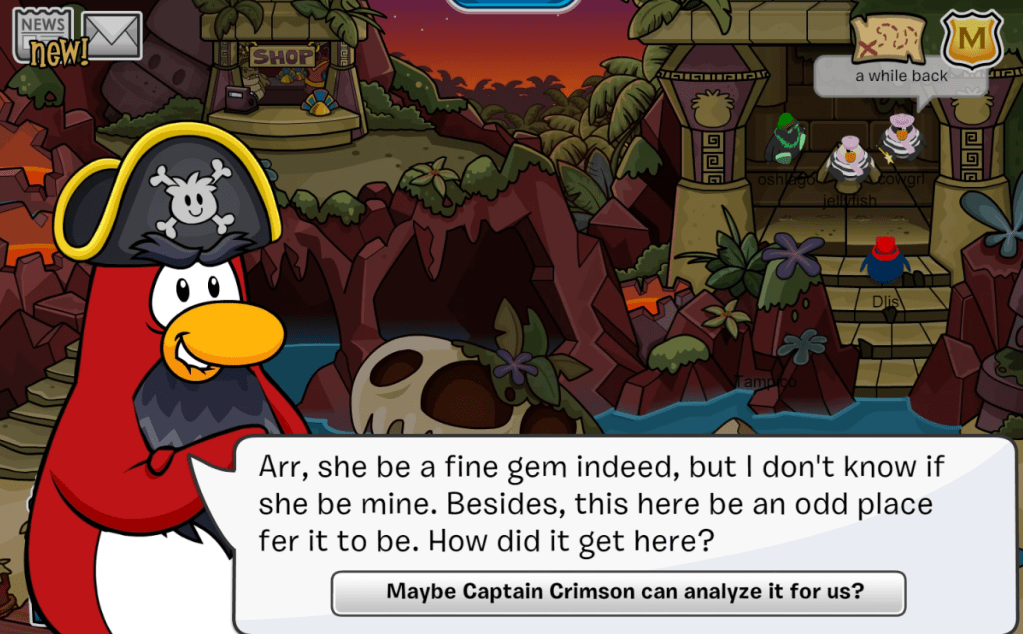 Speaking to Captain Crimson will reveal his plan to steal the gem! However, he will agree to assist you once you offer to take him back to Club Penguin island.