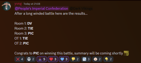 I have put my entire heart and soul into the People’s Imperial Confederation these past three years. Though we have experienced low moments, this fourth generation has undoubtedly been our most successful yet. Though PIC will certainly have room to grow in my absence, I am sure that the Confederation will stand strong and remain a significant player in the army landscape. While I will be resigning as Commander-in-Chief, you won’t have to worry about me disappearing as I will retain my position as Chairwoman. It has been a privilege to witness and take part in a majority of this army’s lifespan and I thank all of you for joining be on this extensive journey. I will undoubtedly do my best to remain present when I can, but it’s time that this amazing army begins a new chapter of history.