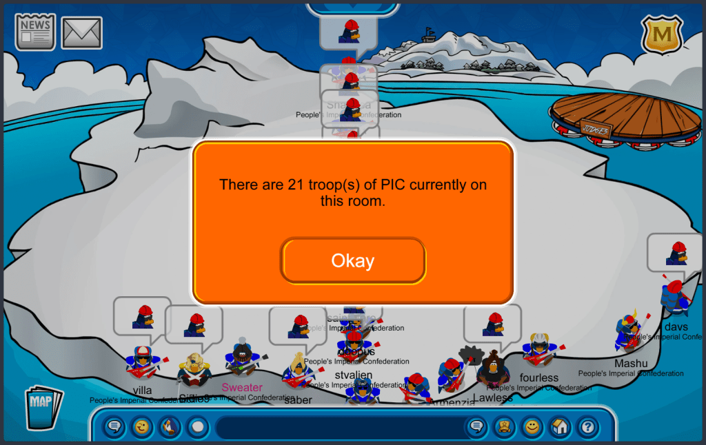 On Friday, September 5th, we logged onto Club Penguin Army Battleground to celebrate the dawn of a new era for PIC, marking our first ‘official’ event under new leadership. At the same time, we managed to reclaim a historic piece of land for the Confederation – Half Pipe. A great time was had by all who attended, and we managed to attain an impressive size!