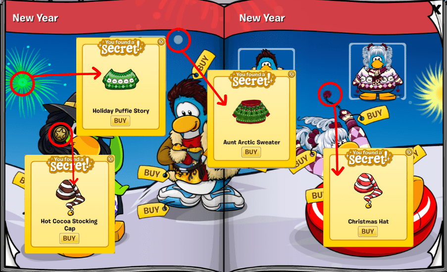 – The middle of the green firework has the Holiday Puffle Story for 450 coins