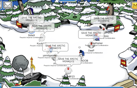 We logged onto Battleground today for our Arctic Monkeys Preservation Project! The Arctic Monkeys are an endangered species on the Club Penguin island. With the goal of preserving them, we marched and protested to raise awareness for their struggle. We had a maximum size of 10 penguins online, featuring no allies this time! Thank you to everyone who showed up. Keep an eye out for details regarding the upcoming Beach Brawl III Victory Parade!