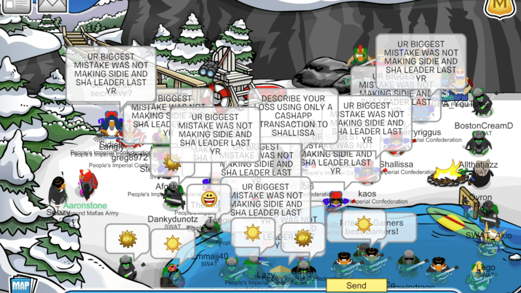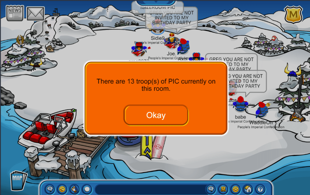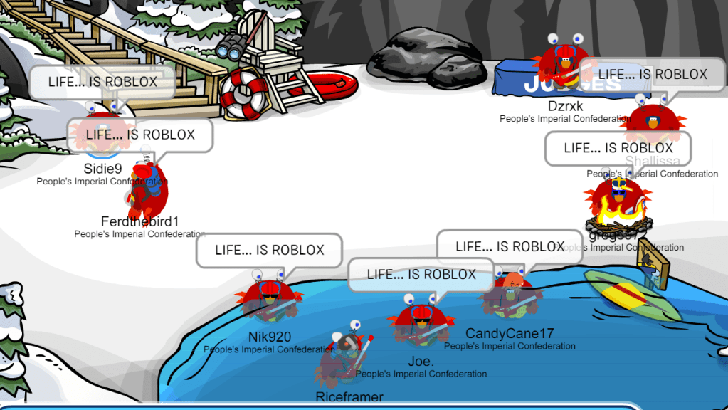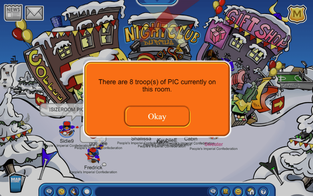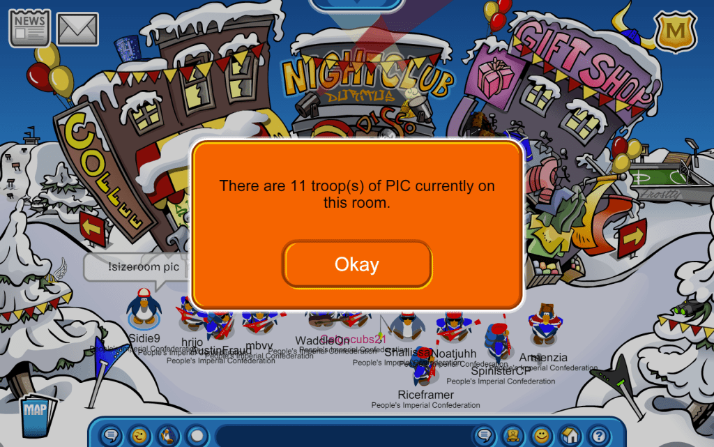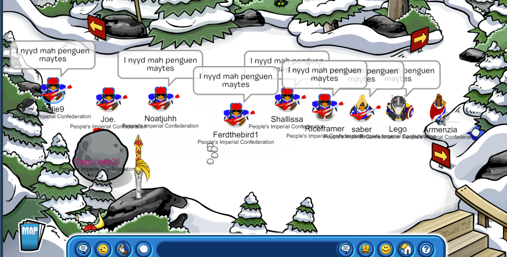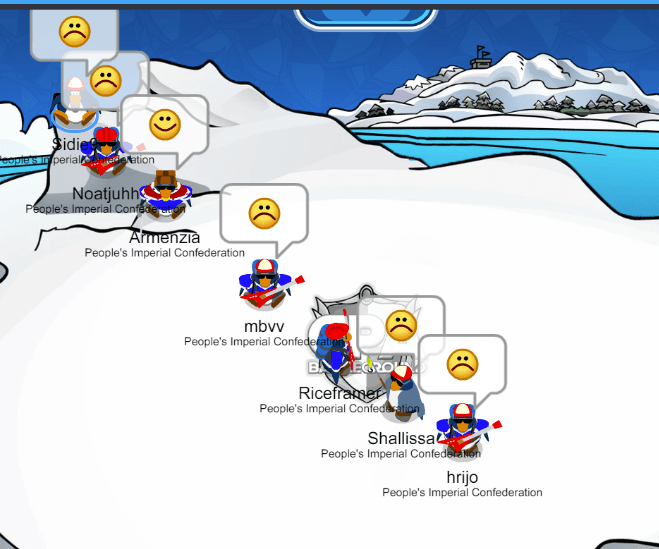 Hey there penguin! We are the People’s Imperial Confederation! We are a Club Penguin Army established in October of 2019, by Small/Medium Army Legend Sidie9. We are a penguin group dedicated to Club Penguin Private Server meetups, on Club Penguin Journey and CPA: Battleground. Join our Discord for a large community full of Club Penguin guides, mascot tracking, and more!