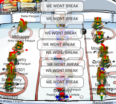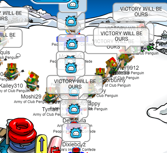 However, the battle was followed by peace talks. It was agreed between Army of Club Penguin Commander Koloway and Manu that the war would conclude with the transfer of our co-capital server Toboggan (CPATG) back to our nation, and a peace treaty between the two armies. Thus, the War of Green Peril has concluded. PIC fought with all its strength in this war and I am proud of you all. This was the Confederation’s first war, and it was declared upon us prematurely. We were not ready, but we were sure as hell willing to fight to the bitter end. You are the best troops anyone could ask for. I love you all.